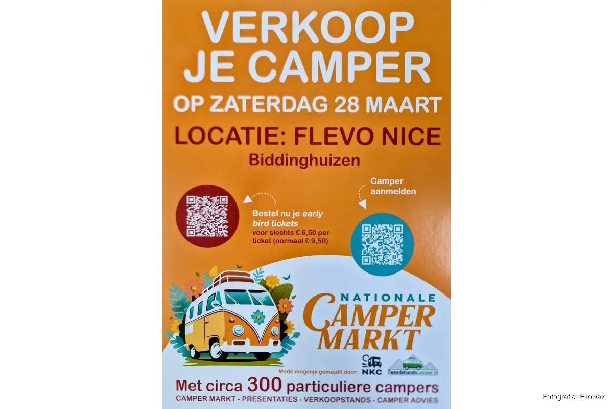 Op zaterdag 28 maart is 3e editie van de Nationale Camper Markt in Biddinghuizen, een innitiatief van NKC en Tweedehandscamper.nl, waarbij circa 300 particulieren hun camper aanbieden voor verkoop, ook wij zijn hier wederom met en stand aanwezig samen met een aantal andere camper gerelateerde bedrijven. Voor slechts € 6,50 kun je een early bird ticket bestellen (normaal € 9,50)