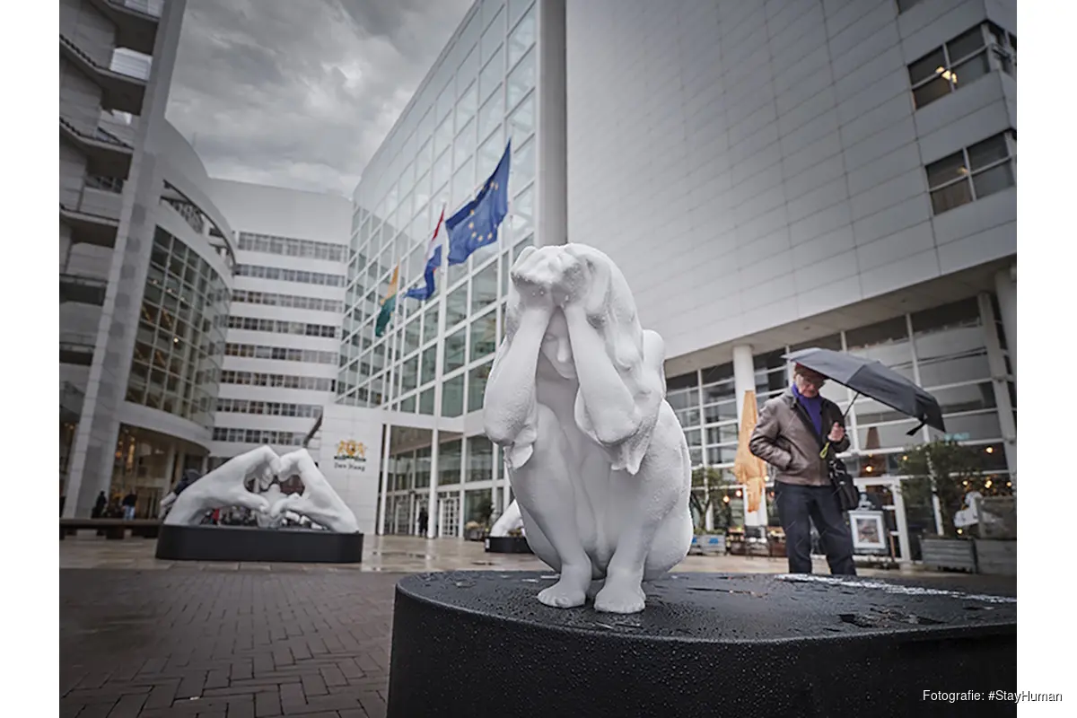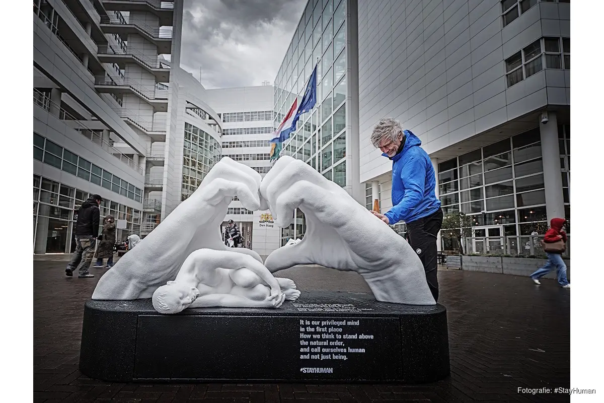DEN HAAG - Vandaag start, pal voor de hoofdingang van het stadhuis in Den Haag, de landelijke tour van de monumentale kunstinstallatie #StayHuman van kunstenaar SAZZA. Dit markeert de aanloop naar de Internationale Dag van de Mensenrechten op 10 december. De reeks naakte menselijke sculpturen, beschermd door immense handen, is een indringende oproep tot meer empathie en menselijkheid in een tijd waarin het publieke debat steeds verder verhardt. De samenleving lijkt steeds verder te polariseren, waarbij de menselijke maat vaak uit het oog wordt verloren.